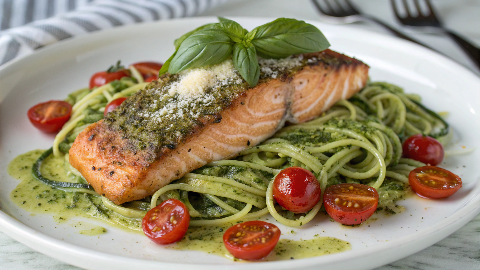 Basil Pesto Salmon with Zoodles punches way above its weight: bold flavor, low effort, and a nutrient profile that makes weeknights feel like a win. Crisp salmon, bright pesto, and playful zoodles—fast food, if fast food had taste and standards.