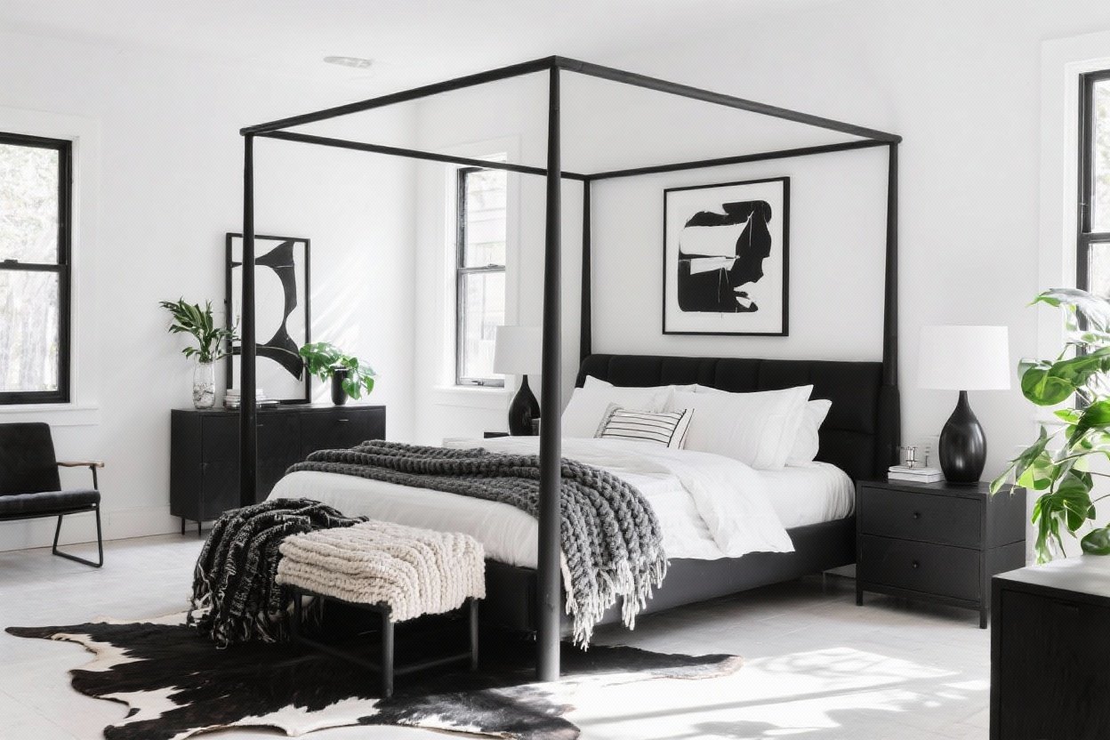 Start strong with your base. If your room is small or light-challenged, lean into white walls and add black accents. Bigger room? You can flip it with a dramatic black wall and bright white bedding.