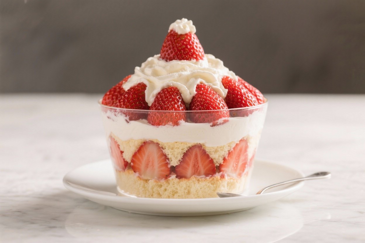 - Repeat: Continue layering cake, strawberries, and cream until you reach the top.Aim for 3–4 layers, finishing with cream.