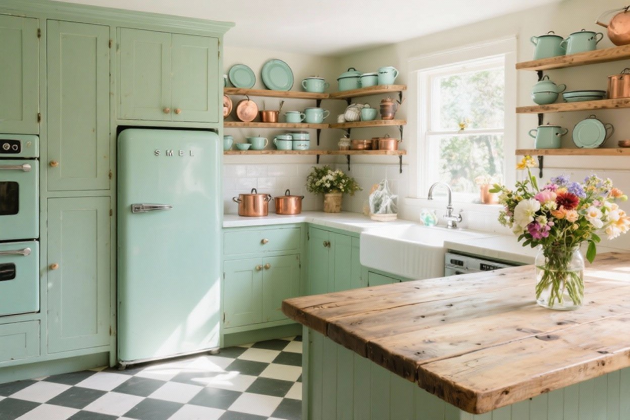 The right palette is everything. Vintage kitchens love muted, cozy tones with a few cheerful notes. Think cream, olive, duck-egg blue, soft black, buttery yellow—timeless and welcoming.